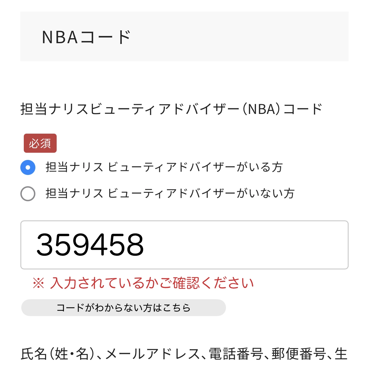 担当ナリスビューティアドバイザーコード(NBAコード)の欄に、